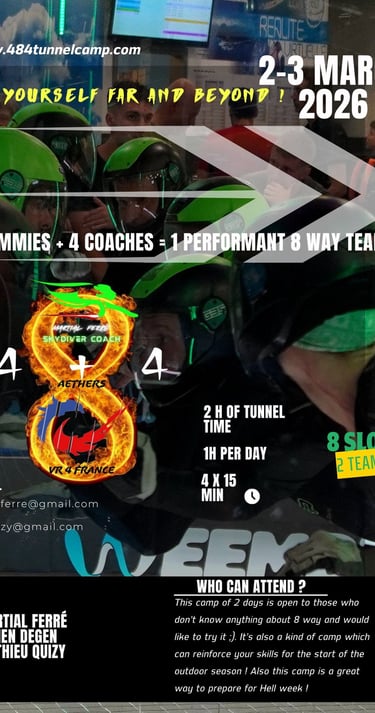 IMAGINE having a coach as your piece partner and a coach as your clone, you are set up for SUCCESS! We will place you with a group of similarly skilled skydivers and 4 current top class 8 way flyers creating a team for a camp of 3 days !